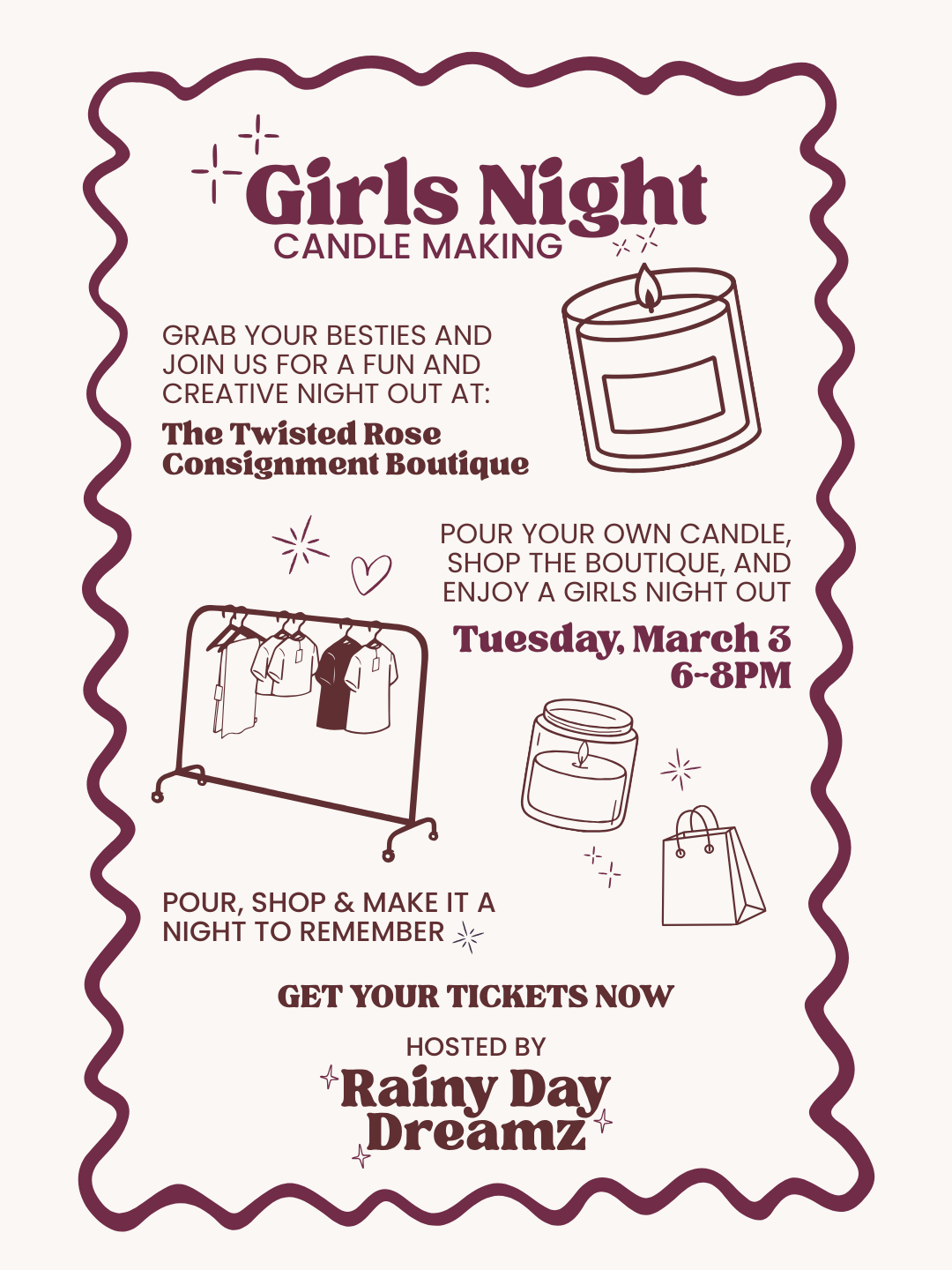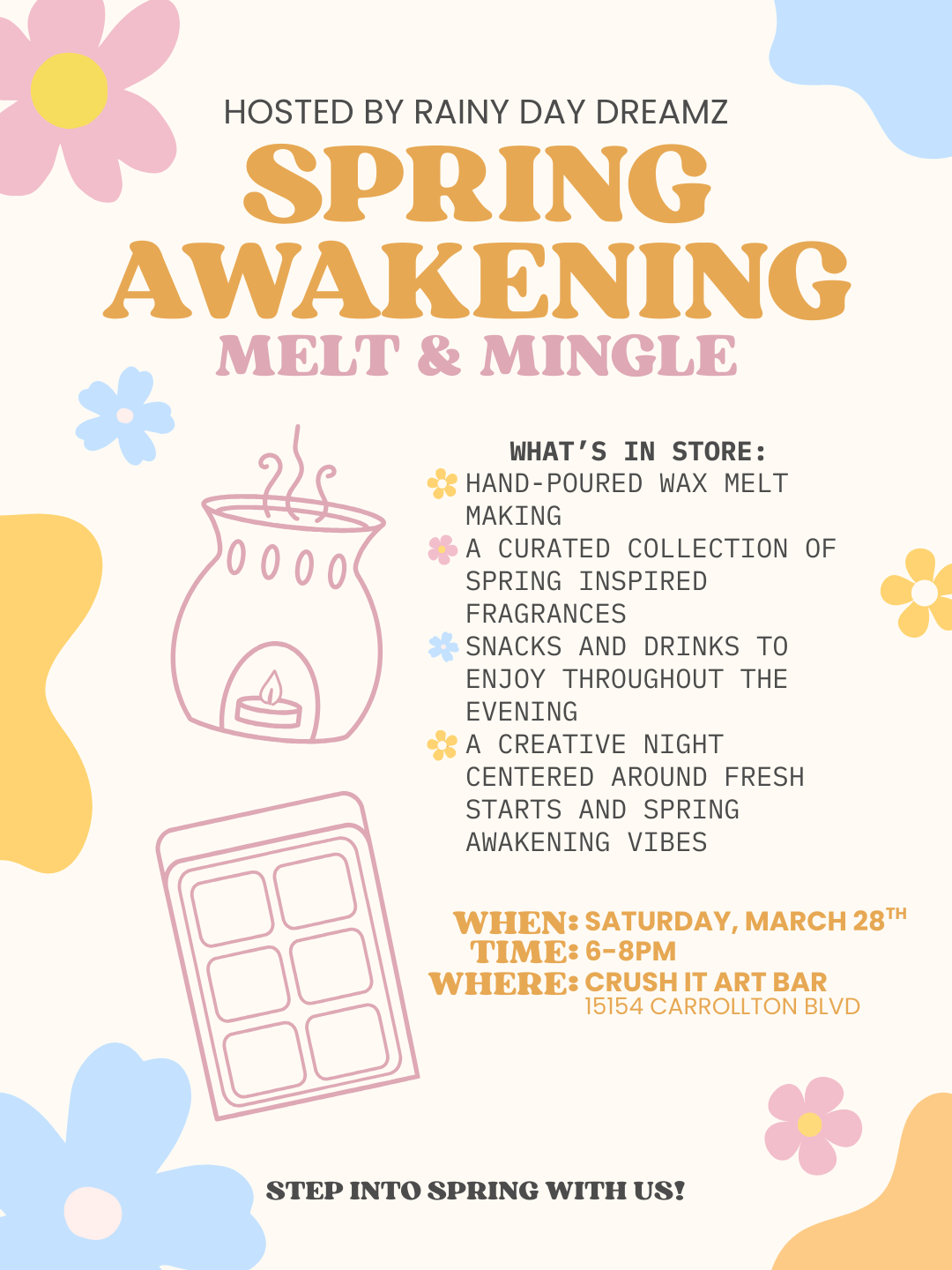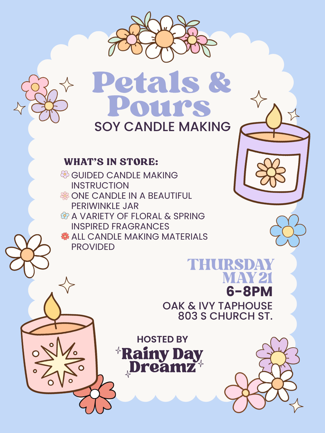 Step into a dreamy, hands-on experience with our mobile candle/wax melt making! I’ll bring all the supplies to you, so you can kick back, sip on your favorite drink, and get creative as we craft custom soy candles & wax melts together. Whether you're celebrating a special moment or just looking for a fun and chill hangout, this is the perfect way to make lasting memories. Let’s create something beautiful and have a blast doing it — book your event today and let’s make some magic happen!