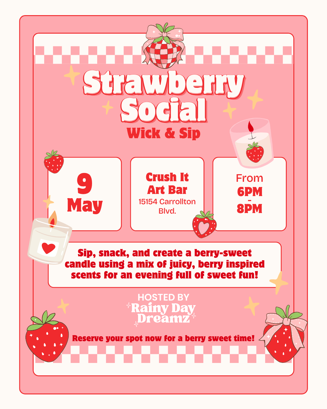 Sip, snack, and create a berry-sweet candle using a mix of juicy, fruit-inspired scents for a night full of sweet Strawberry Social fun!